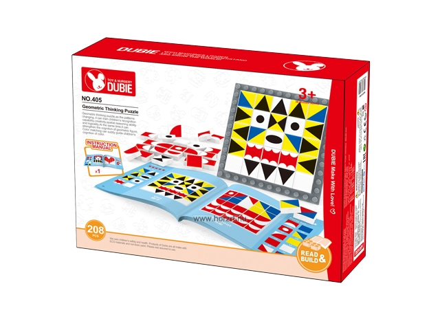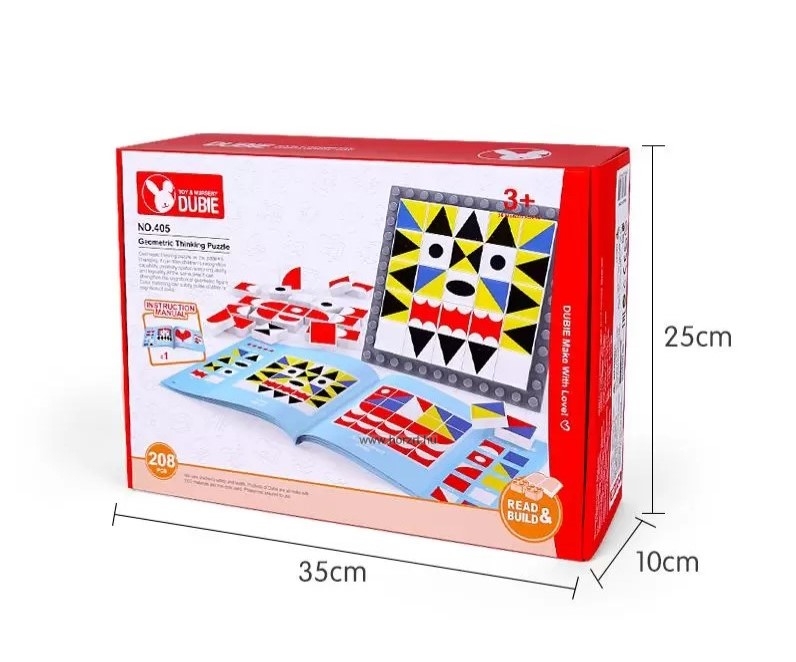 A Dubie mozaiképítője összesen 208 darabból áll. A készletben a mozaik elemken felül megtalálható egy ötletfüzet és egy alaplap is. Az építőelemeken megjelenő geometriai formák minden része élénk színekkel lett megfestve, így látványos képek készíthetőek belőlük. A füzetet követve előre megtervezett, különböző nehézségi szint alapján besorolt képeket készíthetnek a gyermekek, de lehetőségük van a saját fantáziájuk által megalkotott képek kirakására is. A játék magas minőségű műanyagból készült. Az alaptábla kis szögecses kialakítása miatt a mozaikelemek könnyedén rögzíthetőek hozzá. A doboz mérete: 35x10x25 cm.
