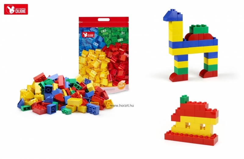 A szettben összesen 150 db, élénk kék, sárga, zöld és piros építőelem található.