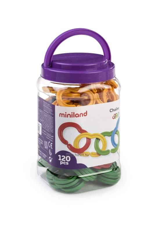 A MINILAND láncfűző készlete érdekes szórakozást nyújthat az óvodás korosztálynak. A láncszemek nagy méretének köszönhetően már egészen 2 éves kortól ügyeskedhetnek a gyermekek és szabadon fűzhetnek hosszabbnál-hosszabb láncokat.