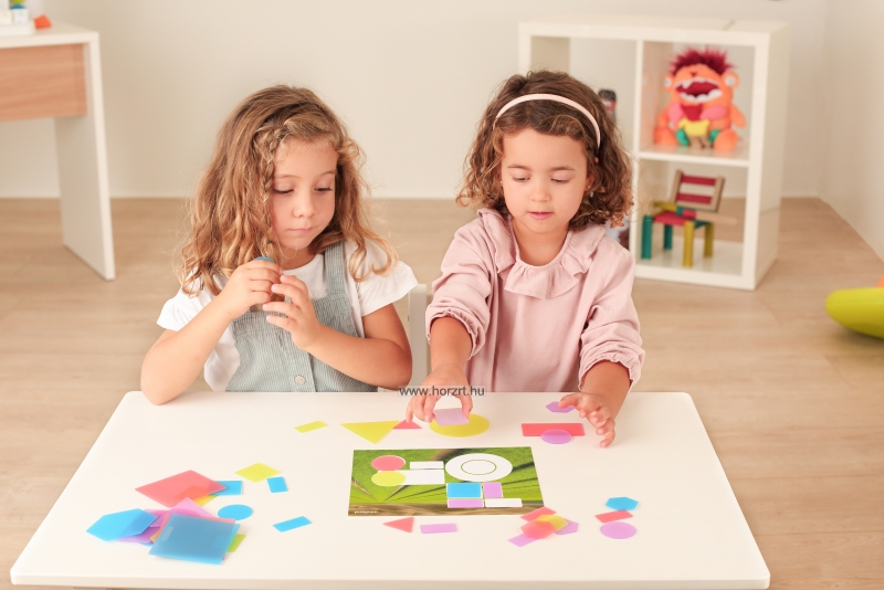 Megtanulhatják, mi a kicsi és a nagy közötti különbség, illetve a lapok áttetszőségének köszönhetően, ha két elemet egymásra helyezünk, akkor a színkeverés alapjait is elsajátíthatják.