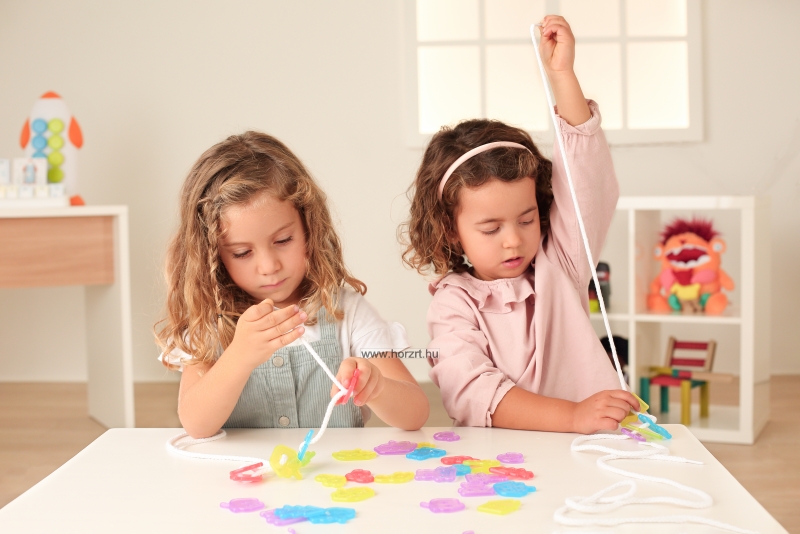 A minél sokszínűbb feladatok érdekében 10 db feladványkártya is a szett részét képezi, így a gyermekek önállóan is tudják fűzögetni a formákat, a megadott szabályt követve.