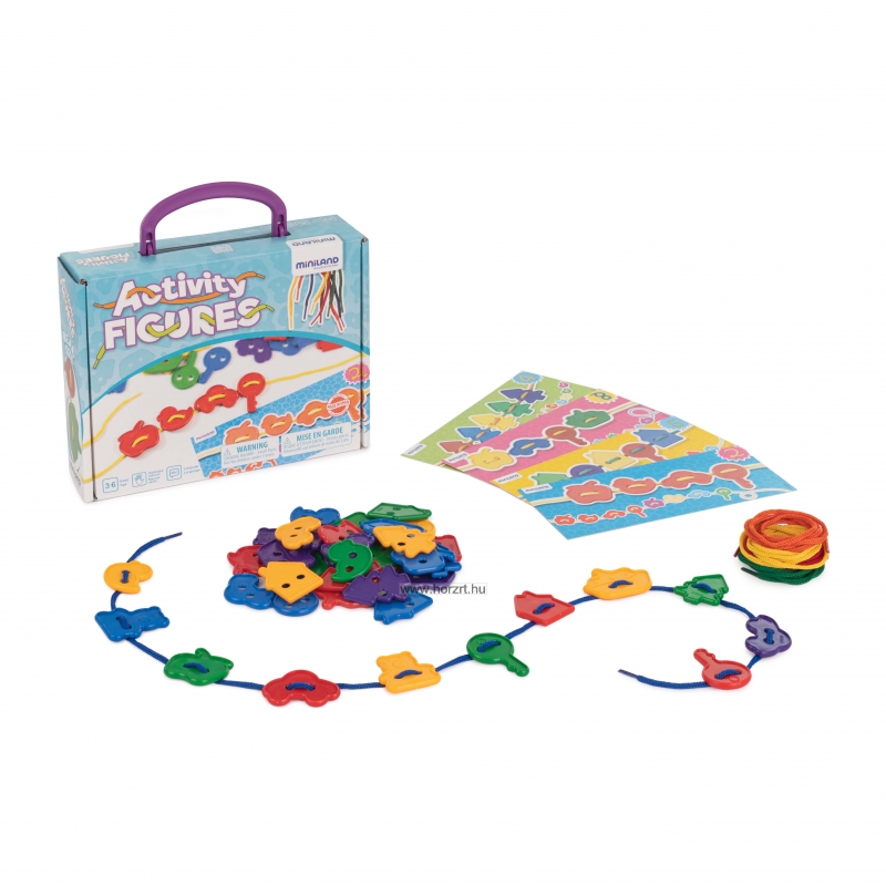 A minél sokszínűbb feladatok érdekében 12 db feladványkártya is a szett részét képzi, így a gyermekek önállóan is tudják fűzögetni a formákat, a megadott szabályt követve.