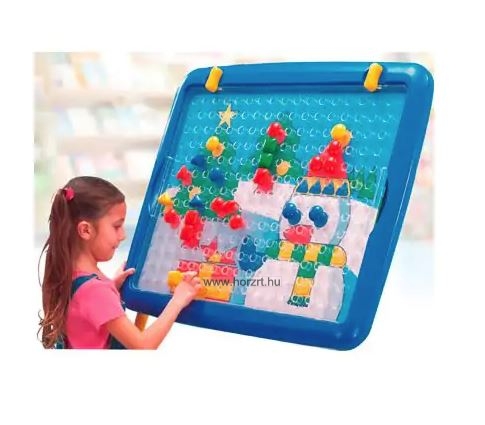 A táblához tartozó alaplapok könnyedén rögzíthetők a műanyag fedőlap alá, így akár előre rajzolt mozaik képeket is kitehetnek az ügyes kiskezek.
