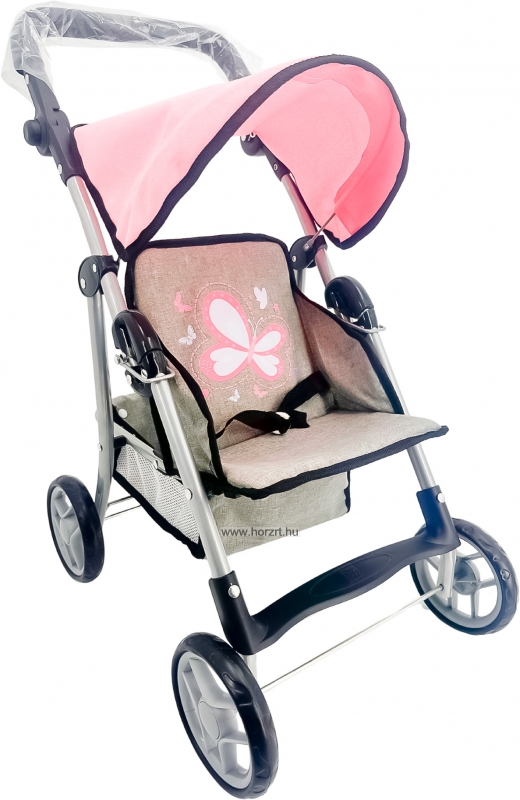 A játékbabakocsi strapabíró, mégis könnyű anyagokból készült, melyet kedves pillangós grafikai is díszít.