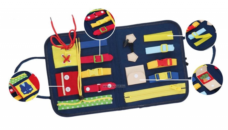 A kis táska formájú készségfejlesztő játék különböző finommotorikai és logikai feladványt tartalmaz.