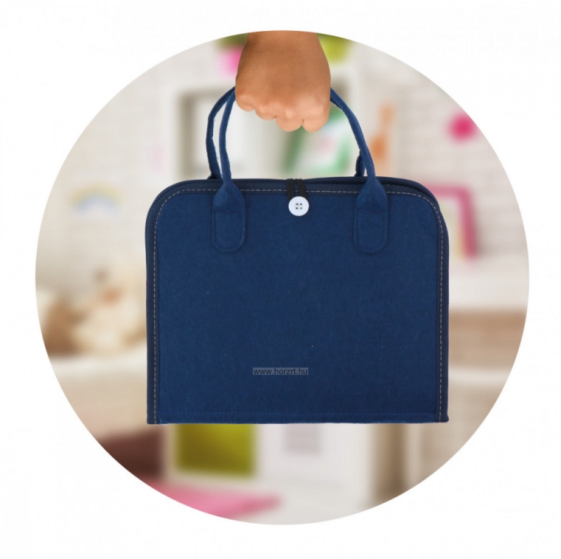 Ha kinyitjuk a sötétkék színű táskát, a belseje tele van a matatófalakhoz hasonló feladványokkal. Többek között pattentos, zipzáros, kapcsos, gombolós és cipőfűzős feladatok is megtalálhatók benne.