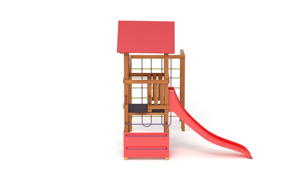létrával, csúszdával - mászóhálóval, bordásfallal - nyújtóval, kis paddal, pulttal - alapterület: 3,8x3,2 m - magasság: 3,55 m - területigény: 8,35x6,5 m - esésmagasság: 1,9 m - rögzítési mód: lábak lebetonozva - lábak száma: 9 db - ütéscsillapítás: 46 m2, anyaga: pácolt fenyő, fém tartóláb, HDPE lemez, platólemez
