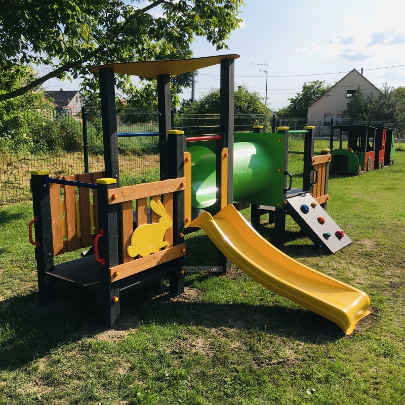 Újrahasznosított műanyag tartógerendákkal, díszített HDPE oldalelemekkel, tanúsítással rendelkező csúszdával, mászófallal, HDPE tetővel