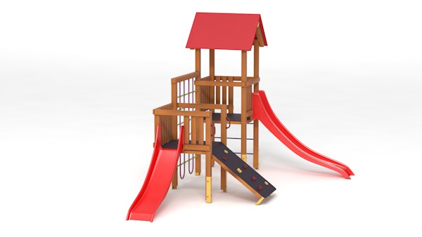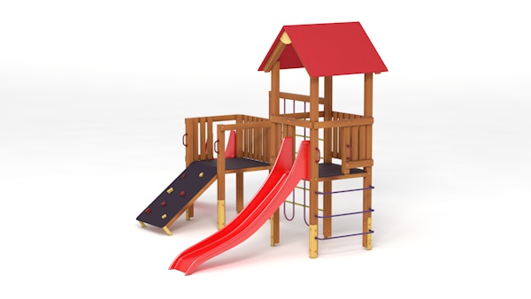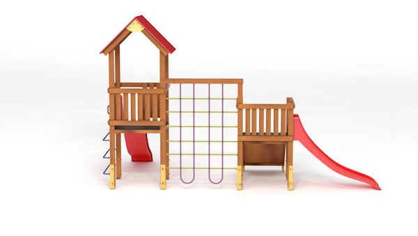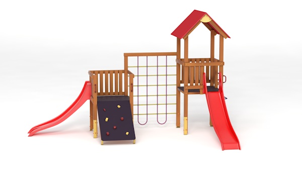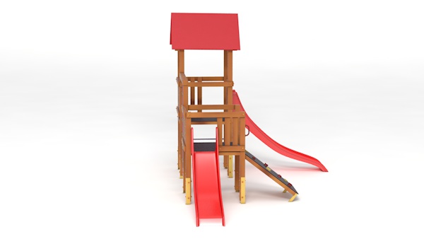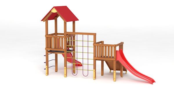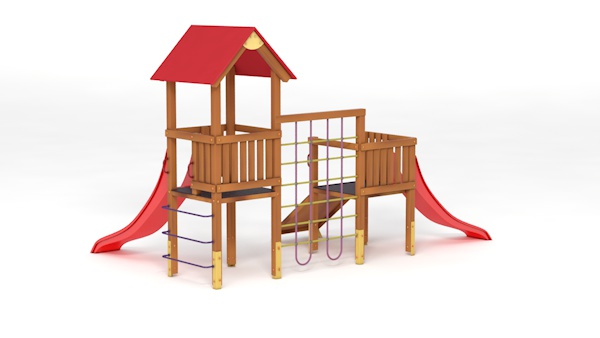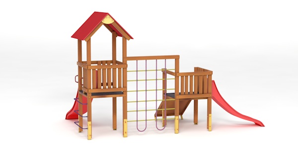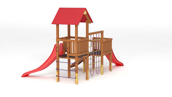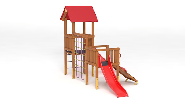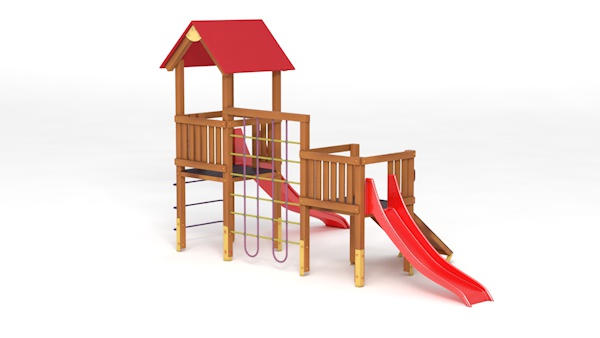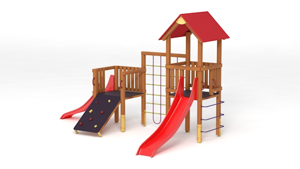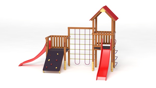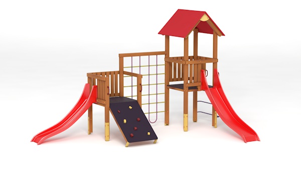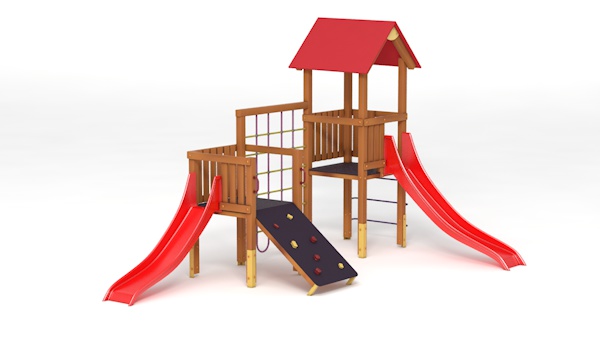 A kéttornyos vár játékkomplexum számos izgalommal várja a kicsiket, két különböző magasságból induló csúszdával, mászólétrával, kötélhálóval és mászóköves ferde rámpával egyaránt rendelkezik.