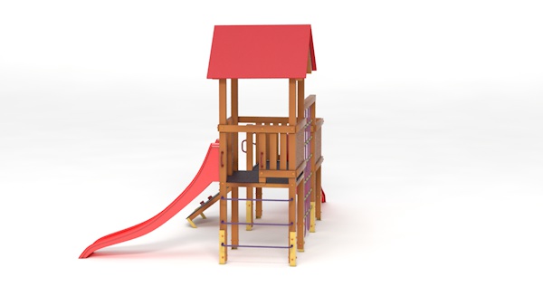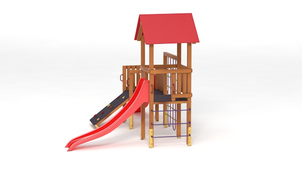 Kültéri szinterezési eljárással felületkezelt fém tartólábak, hossztoldott, élmart, rétegragasztott és vékonylazúrral kétszeresen felületkezelt, kontrapozíciós fenyőből készült váz, dekoratív, UV álló, HDPE műanyag elemek, illetve üvegszálas műanyagból készült beülőkaros csúszda teszi lehetővé a biztonságos használatot és a hosszú élettartamot.