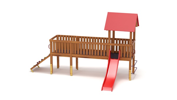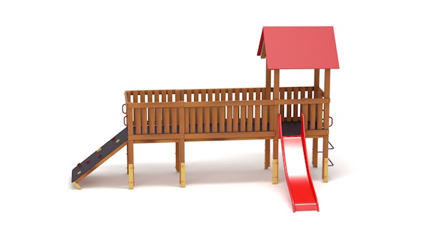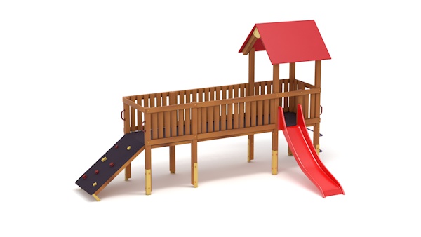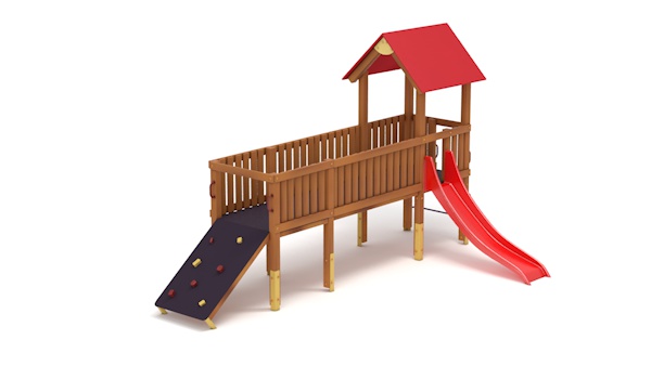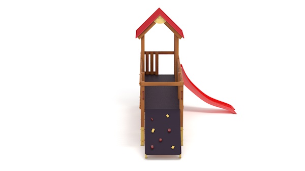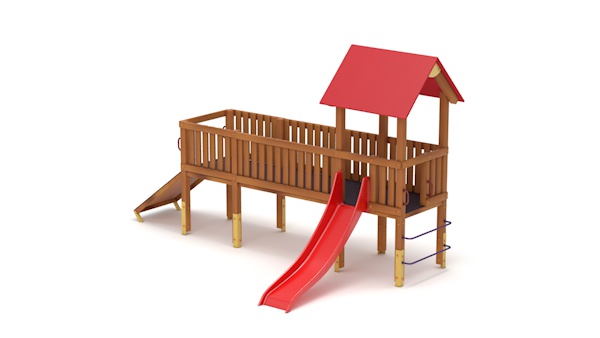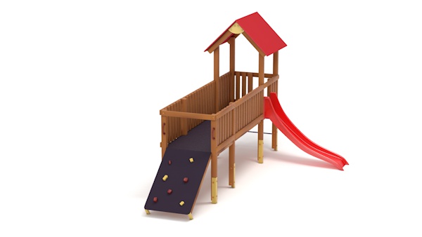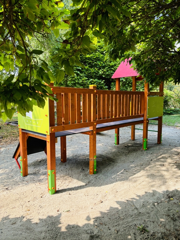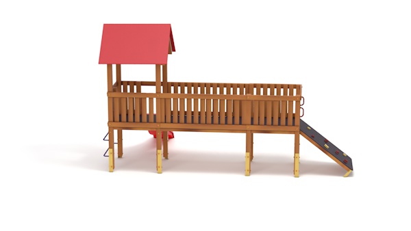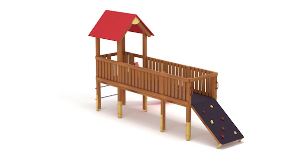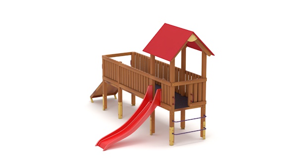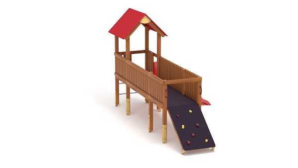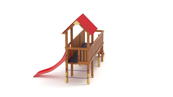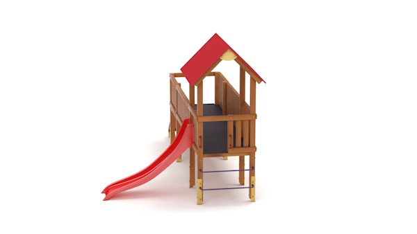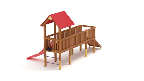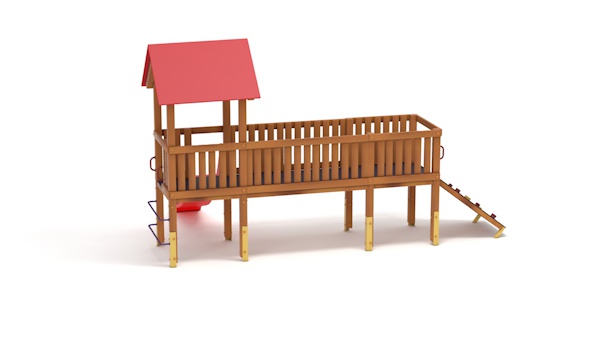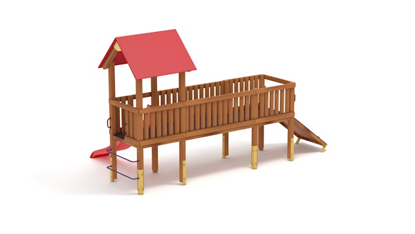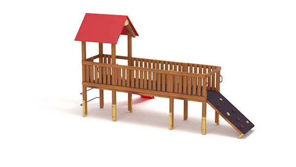 Kültéri szinterezési eljárással felületkezelt fém tartólábak, hossztoldott, élmart, rétegragasztott és vékonylazúrral kétszeresen felületkezelt, kontrapozíciós fenyőből készült váz, dekoratív, UV álló, HDPE műanyag elemek, illetve üvegszálas műanyagból készült beülőkaros csúszda teszi lehetővé a biztonságos használatot és a hosszú élettartamot.