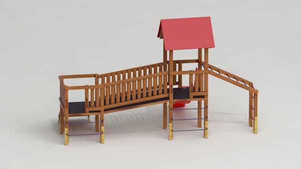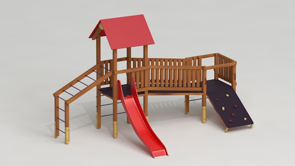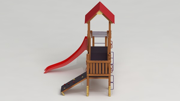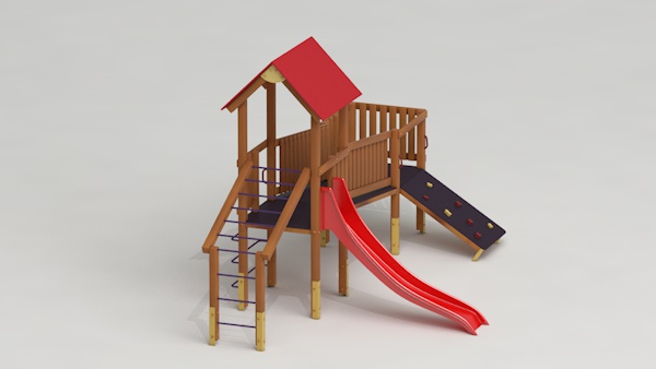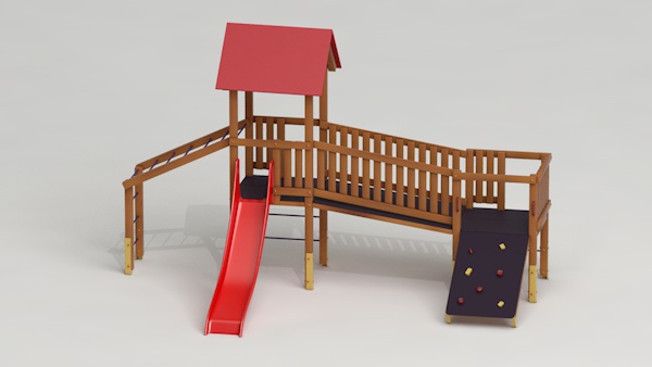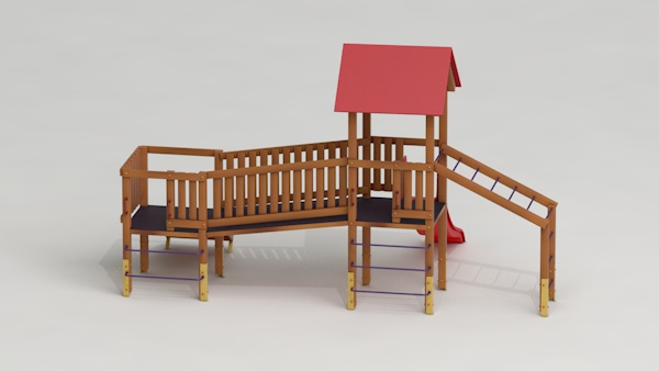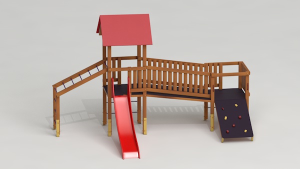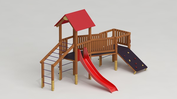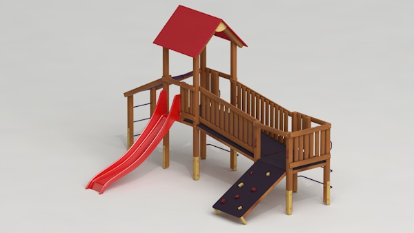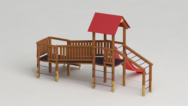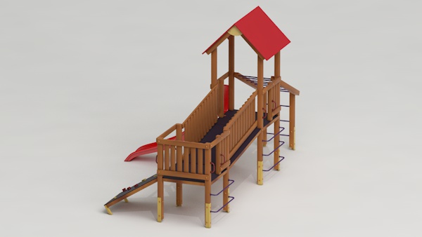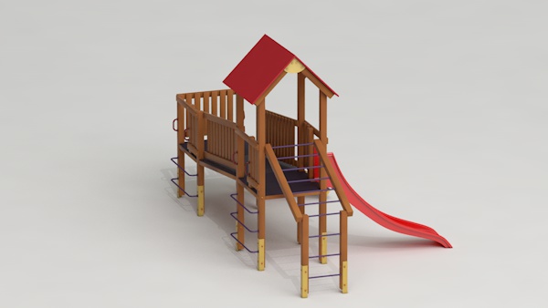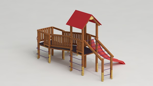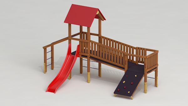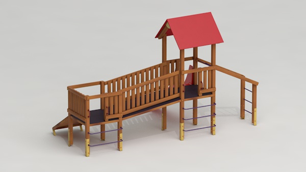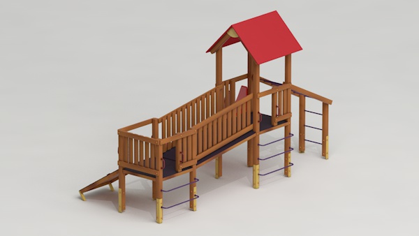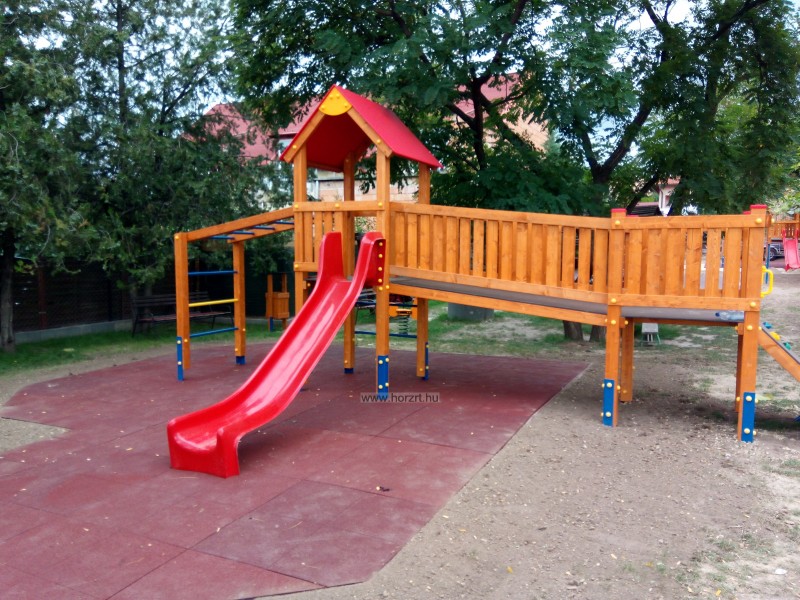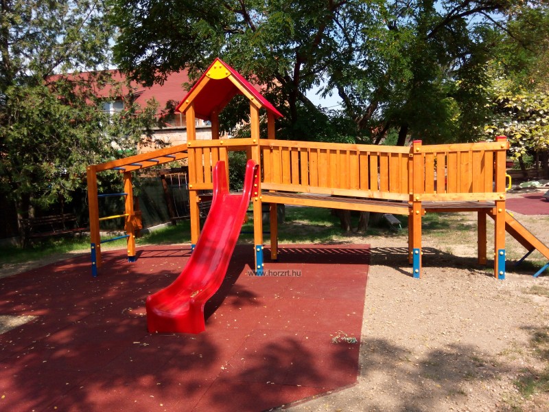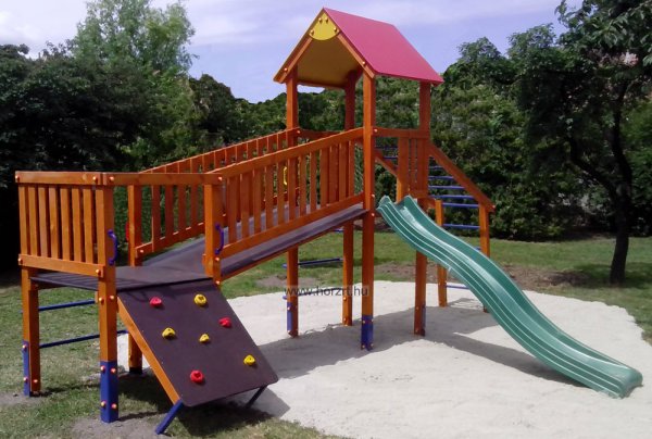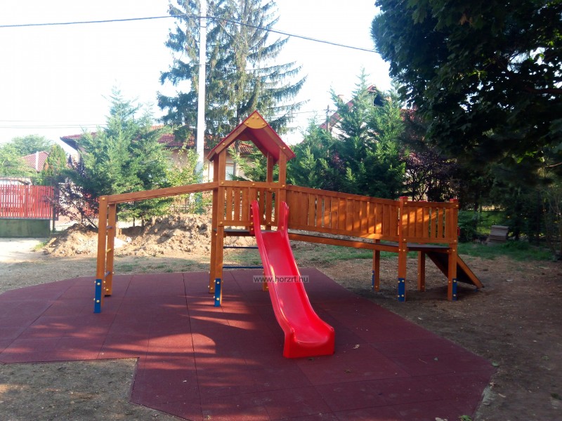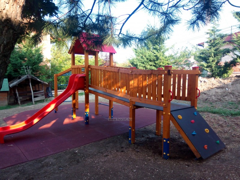 létrával, rámpával, - csúszdával, mászókával, - ferde híddal, - alapterület: 6,5x3,7 m - magasság: 3,25 m - területigény: 9,62x6,65 m - esésmagasság: 1,5 m - rögzítési mód: lábak lebetonozva - lábak száma: 12 db - ütéscsillapítás: 32 m2, anyaga: pácolt fenyő, fém tartóláb, HDPE lemez, platólemez