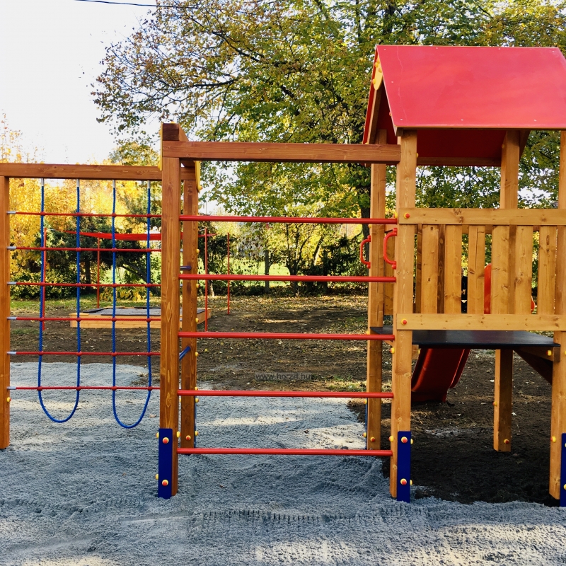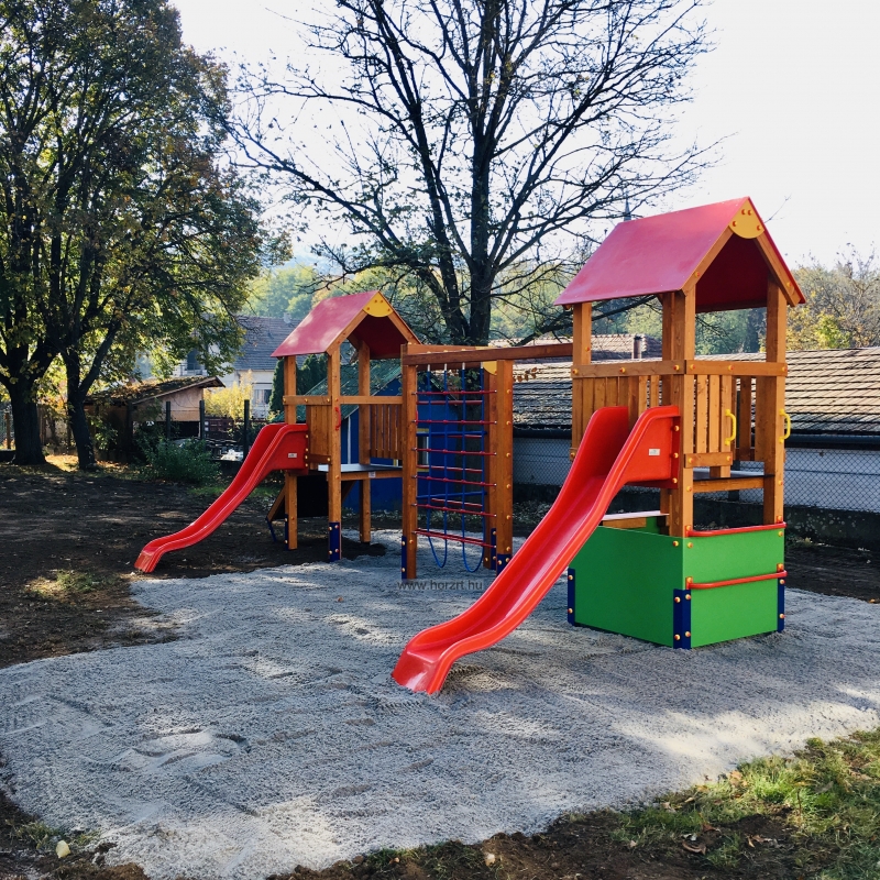 A 2006 évtől forgalmazott hazai fejlesztésű és gyártású, rugalmasan, a helyi igényekhez alakítható játszótéri eszközcsalád tagjai szerkezetükben pácolt fenyőből, színterezett fém tartólábakkal készülnek. Nagy tartósságú, színes HDPE műanyag és festett, vízálló lemez lapokkal, kiváló minőségű műanyag kiegészítőkkel, alapáron műanyag csúszdákkal szerelt, törekvésünk szerint szép, színes, hazai igényekre optimalizált, nagy játszóértékű, tartós játékok. Az eszközök megfelelnek a vonatkozó, új MSZ EN 1176/1:2008 szabványnak, és rendelkeznek Tanúsítvánnyal. - A játszótéri eszközeinknél a feltüntetett árak bruttó árak, tartalmazzák az áfát. - További felmerülő költségek: - - szállítási költség, mely függ a megrendelt eszközök számától, fajtájától, a szállítási távolságtól - telepítési költség, az eszközszámtól függően 12-18% - ütéscsillapító gumiburkolat, gumitégla, vagy folyami homok a terület nagyságától függően - használatbavételi TÜV ellenőrzés