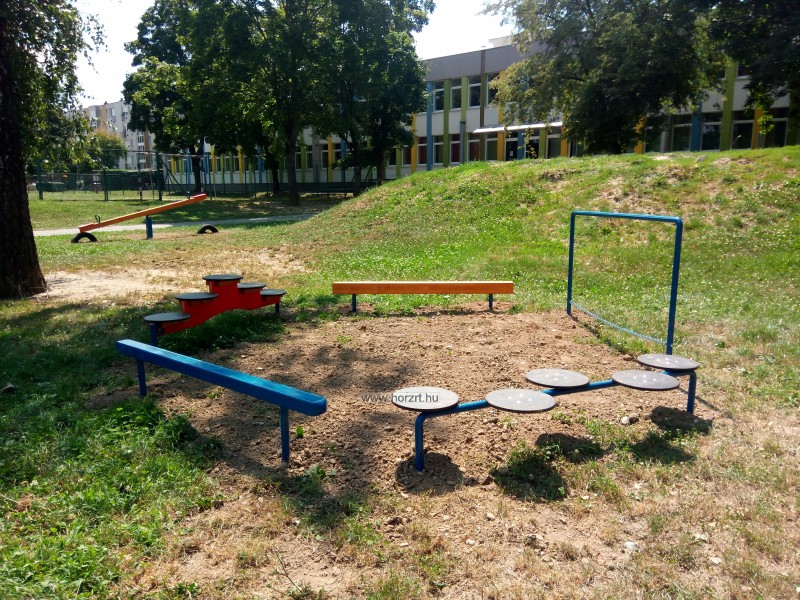 Kültéri egyensúlyozópálya gyerekeknek különféle játszóelemekkel.