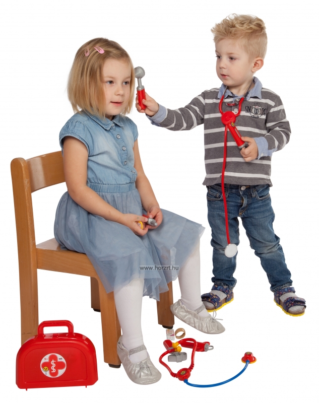 A piros színű, praktikus fogantyúval ellátott táska tartalmazza a legfontosabb orvosi eszközöket: sztetoszkópot, lázmérőt és fecskendőt. Ezek az eszközök segítenek a gyermekeknek megismerni az orvosi vizsgálatok során használt tárgyakat, miközben fejlesztik motorikus készségeiket és fantáziájukat. A játék célja, hogy a gyermekek játékos formában oldják meg a betegek gyógyítását, miközben megismerkednek az orvosi eszközökkel és azok használatával.?