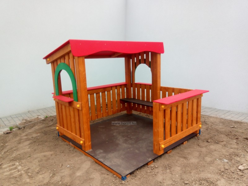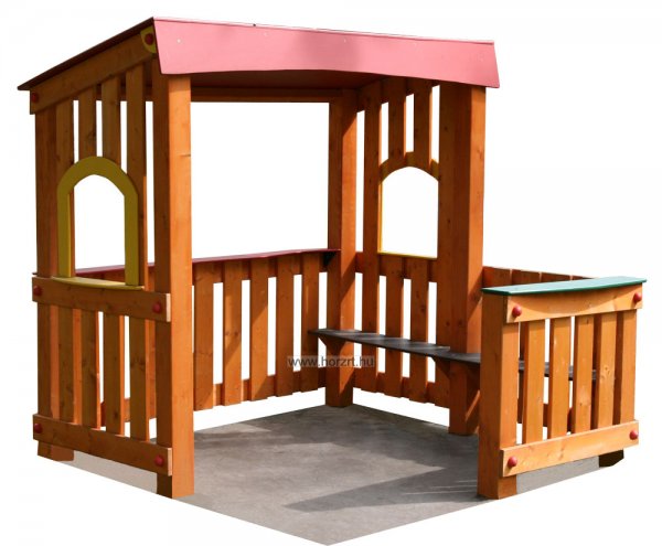 Kültéri fa házikó gyerekeknek. Ülőpaddal kispulttal és járófelülettel felszerelt házikó. A színes HDPE műanyag tető mindamellett hogy növeli a termék élettartamát kellemes hangulatot is ad a játszóeszköznek.