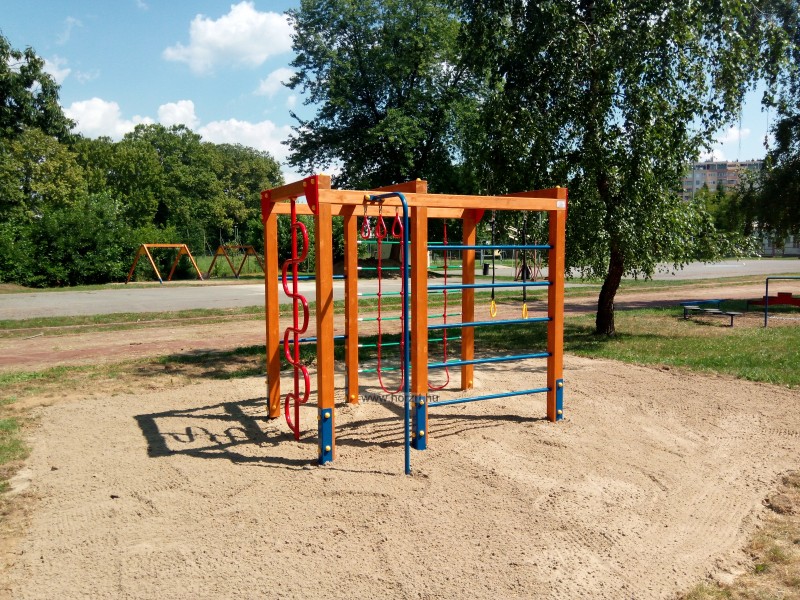 A játszóeszköz az alábbi játszóelemeket tartalmazza: egy tűzoltócső a lecsúszáshoz, egy csimpaszkodó elem, egy gyűrűhinta, egy hullámrúd, egy bordásfal elem és egy kötélháló elem, és a játék tetején csimpaszkodó karikákkal.