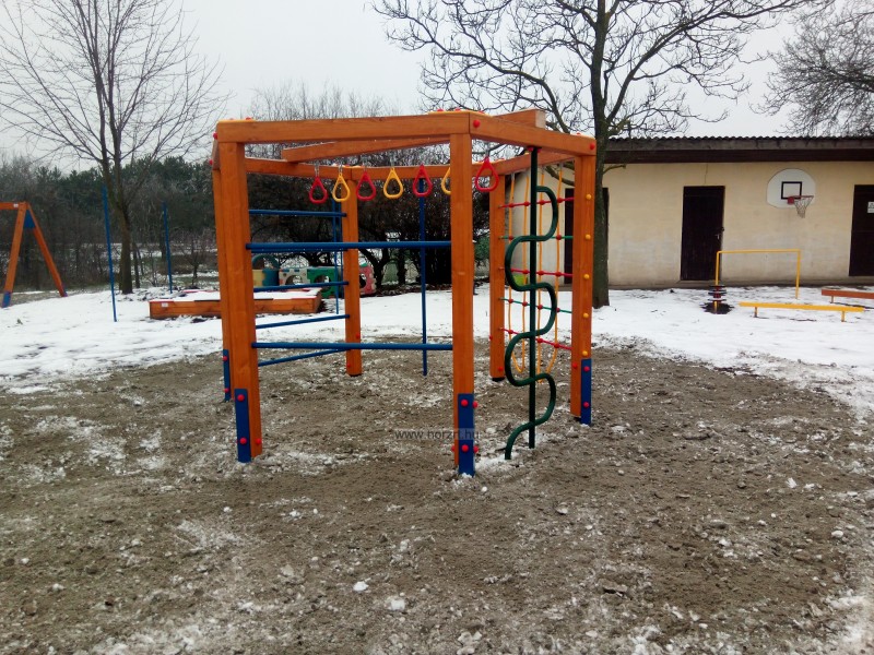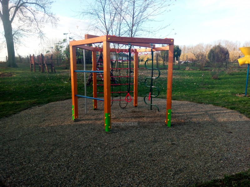 egy csúszórúd, csimpaszkodó elemek, egy gyűrűhinta, egy hullámrúd, egy bordásfal elem és egy kötélháló elem.