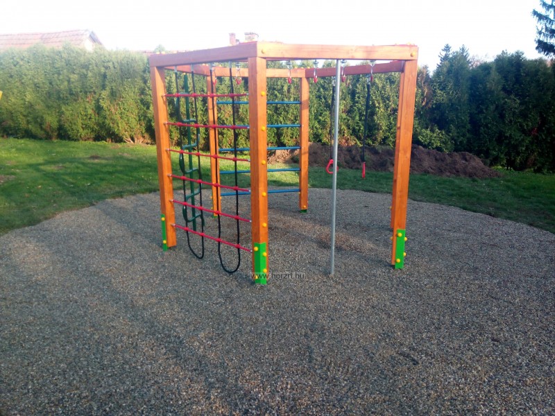 Tartógerendához présgyűrűvel erősített, acélbetétes műanyag mászóháló és fémbetétes, műanyagbevonatos gyűrűhinták és kapaszkodók.