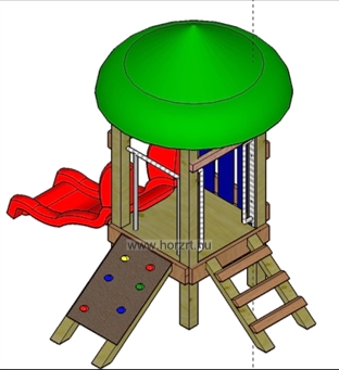 Létrás, csúszdás, mászófalas vár. Alapterület: 3 mx2 m. Telepítési helyszükséglet: 6,5 mx4,6 m. Esési magasság: 60 cm. TÜV tanúsított termék. anyaga: Fa, Kapaszkodók: horgonyzott fém, műanyag