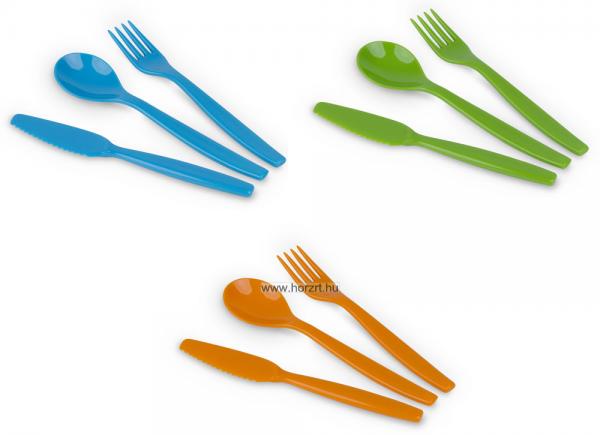 A készlet tartalma: 1 db kanál, 1 db villa, 1 db kés Kifejezetten intézményi felhasználásra kifejlesztve. Ezek az élénk színű evőeszközök rendkívül ellenállóak hővel és vízzel szemben, továbbá mikrohullámú sütőben és mosogatógépben is használhatóak. Különleges anyag összetételük miatt szinte összetörhetetlenek! -40 C foktól +120 fokig hőálló