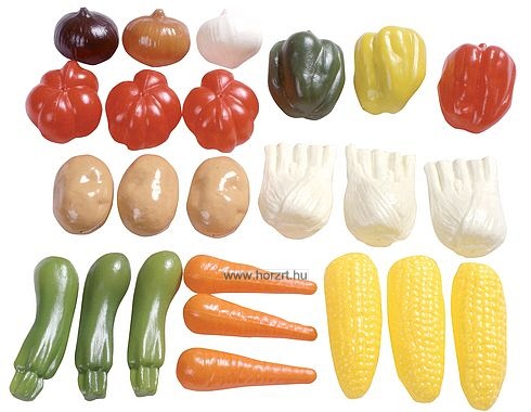 3 db paradicsom, 3 db paprika (piros, zöld, sárga), 3 db burgonya, 3 db répa, 3 db cukkini, 3 db kukorica, 3 db édeskömény, 3 db hagyma (vörös, fehér, lila)