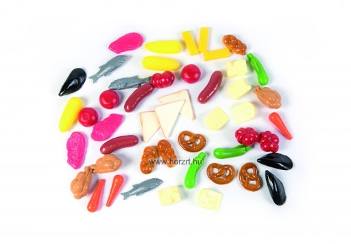 A 48 darabos készlet, többek között a következő zöldésgeket, gyümölcsöket, húsokat és pékárukat tartalmazza: Hal, sült krumpli, hús, kolbász, kukorica, grill csirke, kalács, perec, kagyló, cukkini, répa, sajt, toast szelet, paradicsom, kaliforniai paprika.