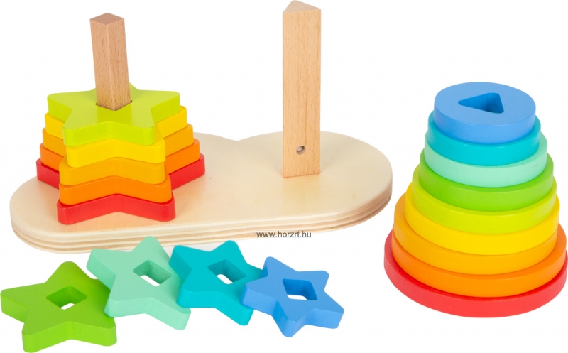 Gyönyörű színes, mint a szivárvány! Ebben a formaillesztős játékban az a cél, hogy azonos méretű formákat rakjunk egymásra, úgy, hogy a szivárvány színei a megfelelő sorrendbe kerüljenek. A válogatásnál, egymásra helyezésnél a gyerekek játékos formában ismerkednek meg a különböző formákkal, színekkel és méretekkel, fejlesztik a finommotorikát és a szem-kéz koordinációt. A mozgatható csapok extra biztonságot nyújtanak! Végtelen variálási lehetőség! Ki teszi teljessé a szivárványt?