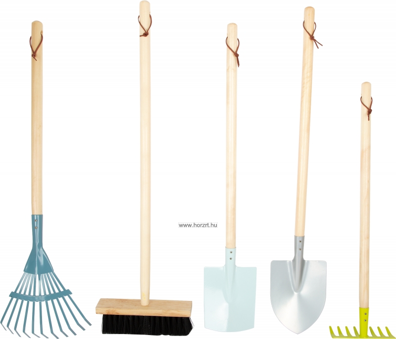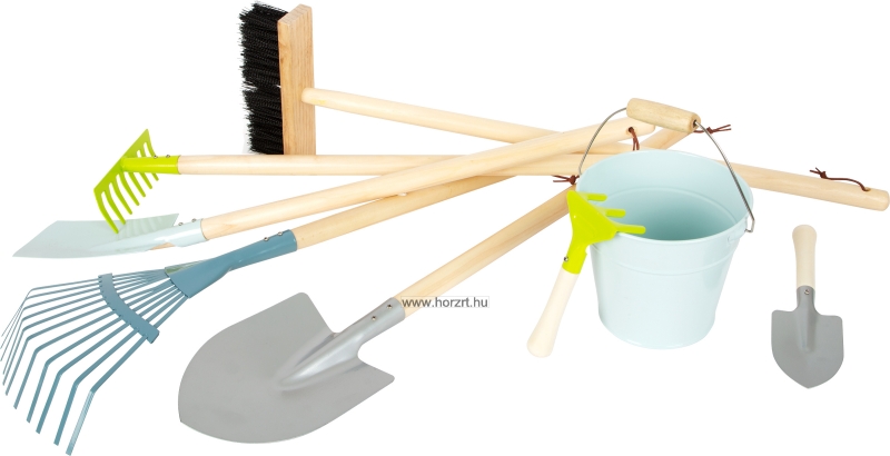 Ez az átfogó, modern színű kertészeti eszközkészlet egy ásót, egy lapátot, egy gereblyét, egy seprűt, egy vödröt és két kis kerti szerszámot tartalmaz, amelyek mindegyike megfelelő munkát kínál egy kis kertésznek.
