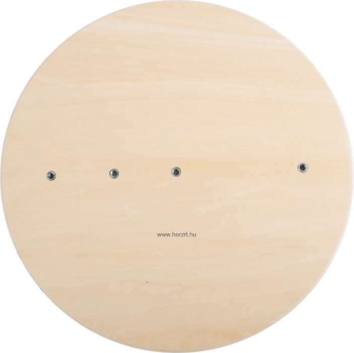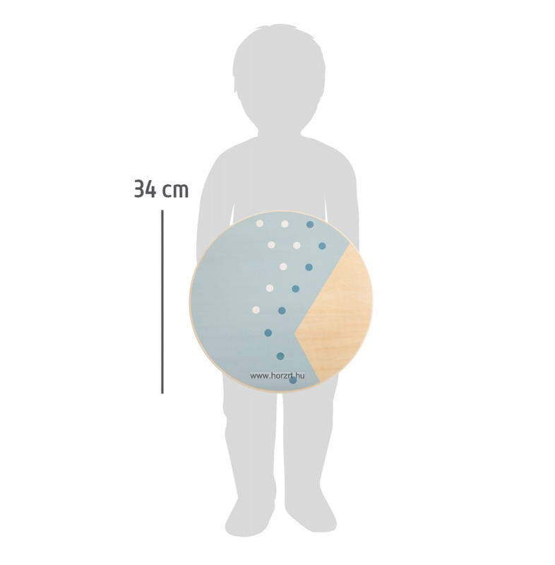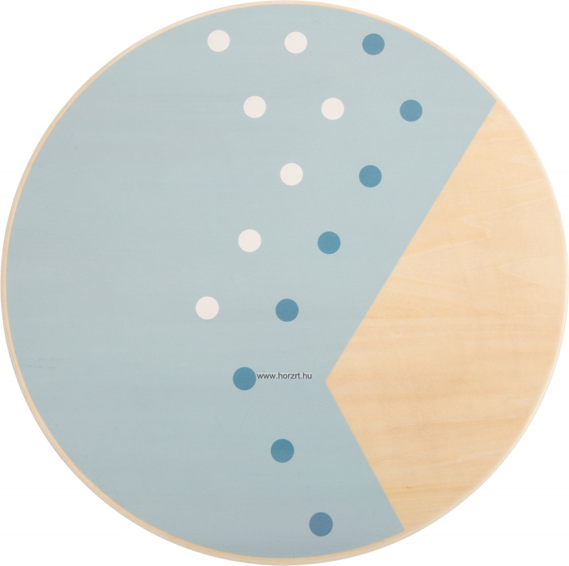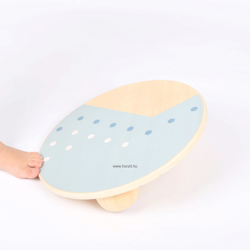 Az egyensúlyozó deszka fából készült, felső korong alakú részén kék színű festét látható. Alsó részén két félgömb alakú billenő elem található.