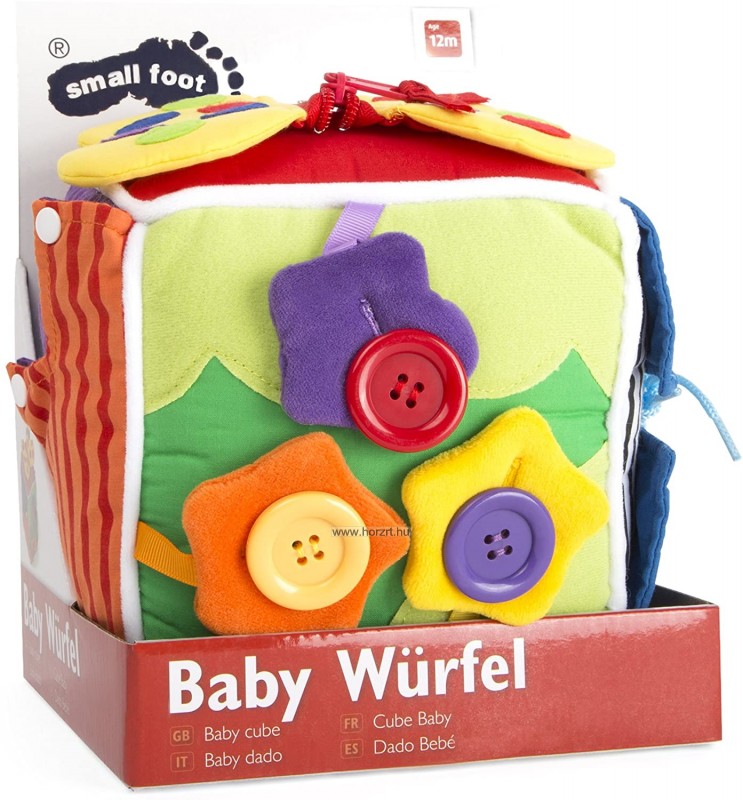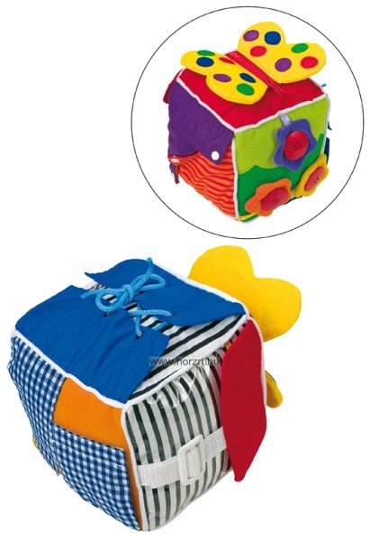 A kocka megtanítja a kicsiket hogyan lehet cipőt kötni, hogyan használja a csatot, cipzárt,gombot, a patentot.