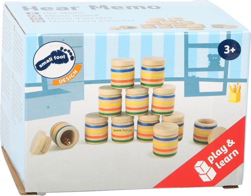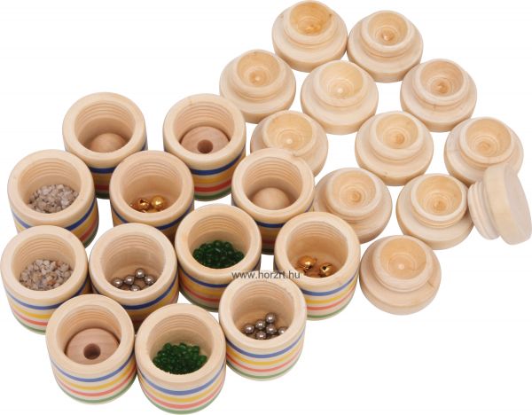 A hangzó dobozokat próbáljuk a hangzásuk szerint megkülönböztetni, és párosítani. A hengerek teteje letekerhető, így kedvünk szerint cserélgethetjük a tartalmukat!