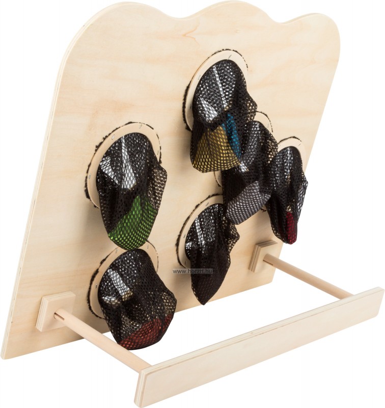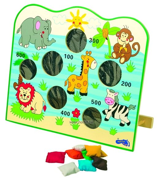 A szem-kéz koordinációt fejleszti ez a tartós, színes játék. A táblán lévő lyukak különböző méretűek, így a több pontot érő helyekre értelemszerűen nehezebb beletalálni a kis babzsákokkal.