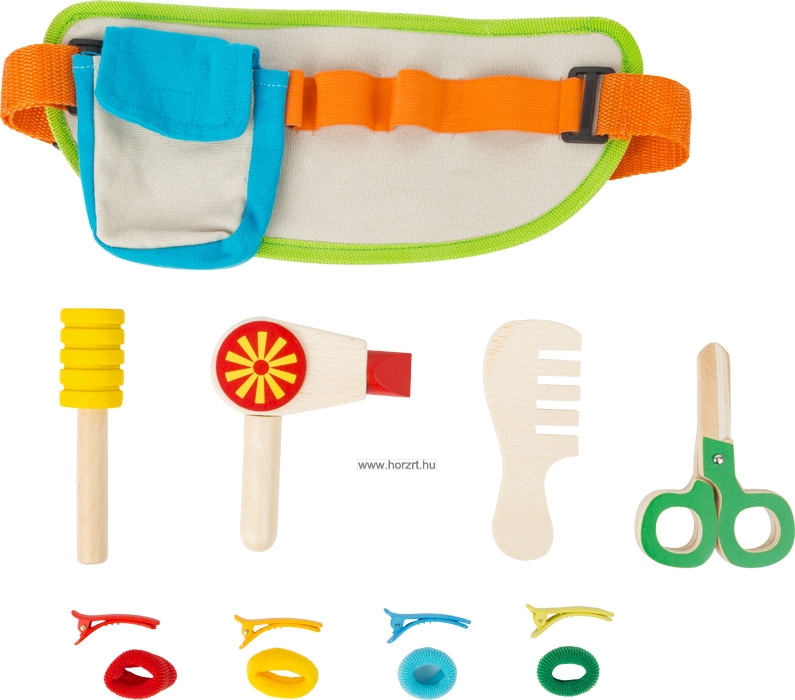 A készlet 13 db-os és az alábbiakat tartalmazza: 4 db hajgumit, 4 db műanyag hajcsatot, 1 db ollót, 1 db hajszárítót, 1 db fésűt, 1 db hajformázót és egy praktikus, tépőzárral állítható övet tartalmaz.