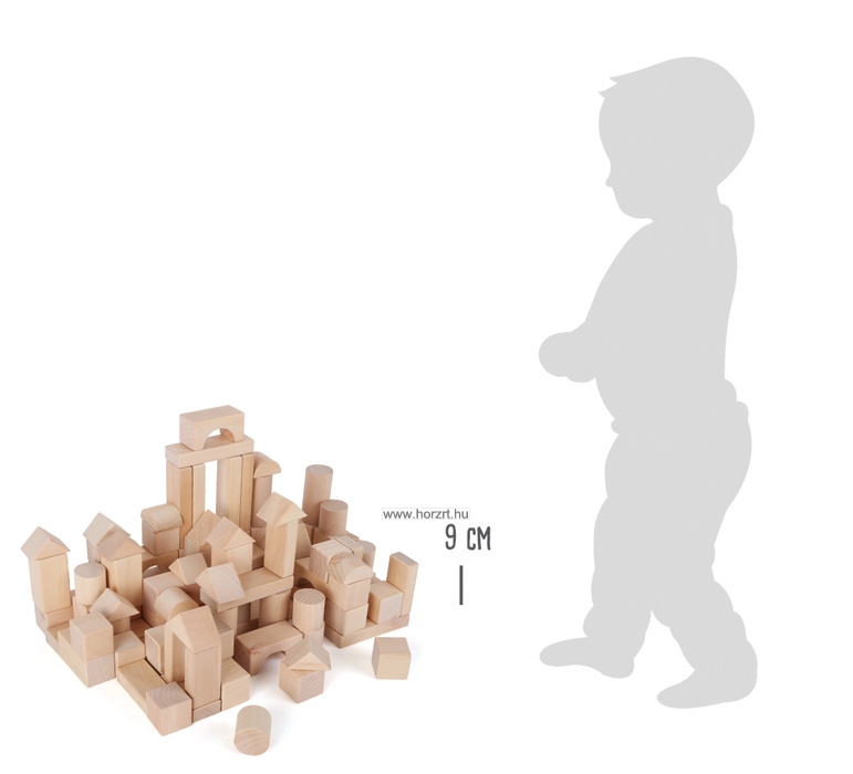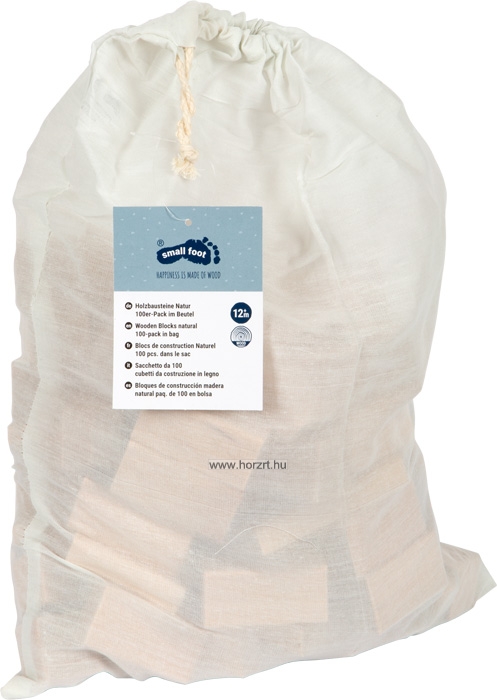 100 darabos fa építőkocka készlet natúr színben, praktikus tároló zsákban. Kocka mérete: 3x3x3 cm, Téglatest mérete: 3x3x6 cm. Legnagyobb hasáb elem mérete: 9x3x1 cm. Anyaga: fa