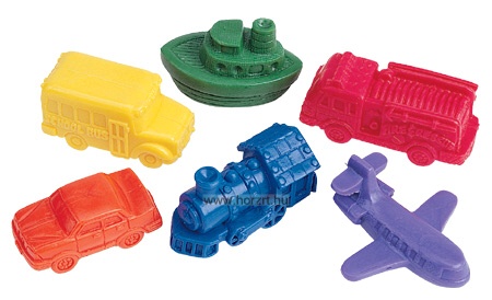6 különböző formájú (iskolabusz, tűzoltóautó, személyautó, vonat, repülő, hajó) és színű jármű található a készletben.