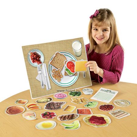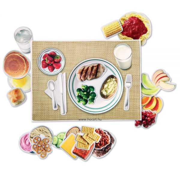 A készlet gyönyörűen illusztrálja az 5 fő élelmiszer csoportot - zöldségek, gyümölcsök, gabonafélék, tejtermékek és húsok. A készlet segíthet a gyerekeknek beazonosítani és kiválasztani az egészséges élelmiszereket. A mágneses pad segítségével a gyerekek összeállíthatják saját egészséges menüjüket, elsajátíthatják étkezési szokásainkat: hogyan terítsük meg az asztalt, hova kerüljenek az evőeszközök, a szalvéta és a pohár.