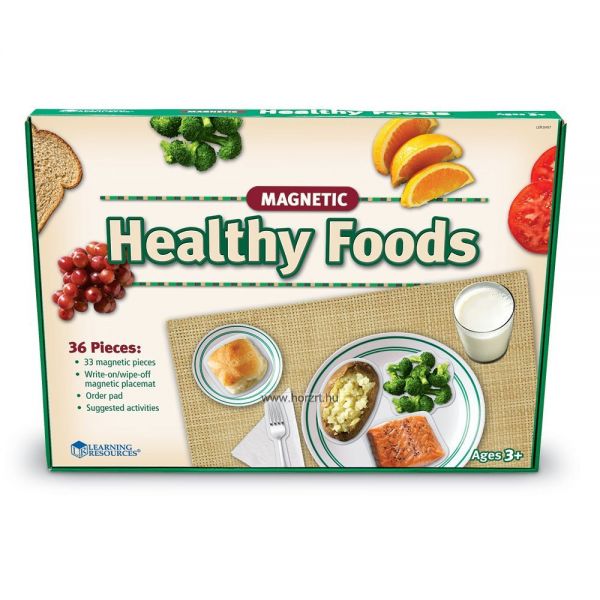 A Learning Resources mágneses egészséges élelmiszer készlete 34 darab kiegészítőt és egy darab mágneses táblát tartalmaz.