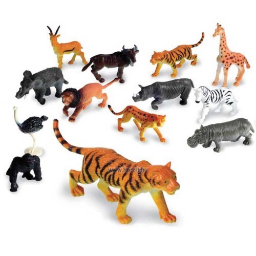 A készletben a következő 12 féle állat található: zsiráf, elefánt, oroszlán, víziló, orrszarvú, tigris, gepárd, strucc, gorilla, antilop, gnú, zebra, fajtánkét 5-5 darab.