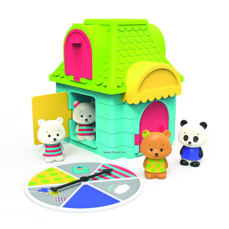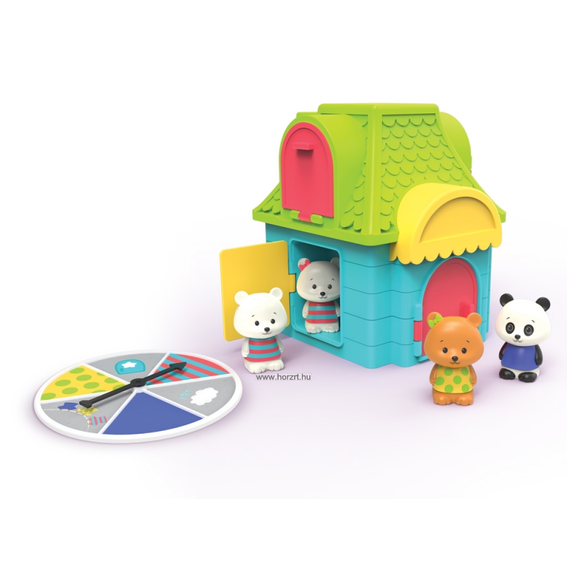 Tartalma: Játékház 7 színes ajtóval, 3 pár színben passzoló maci, játékkorong pörgetővel, szülői útmutató, ami 3 játékvariációt tartalmaz.