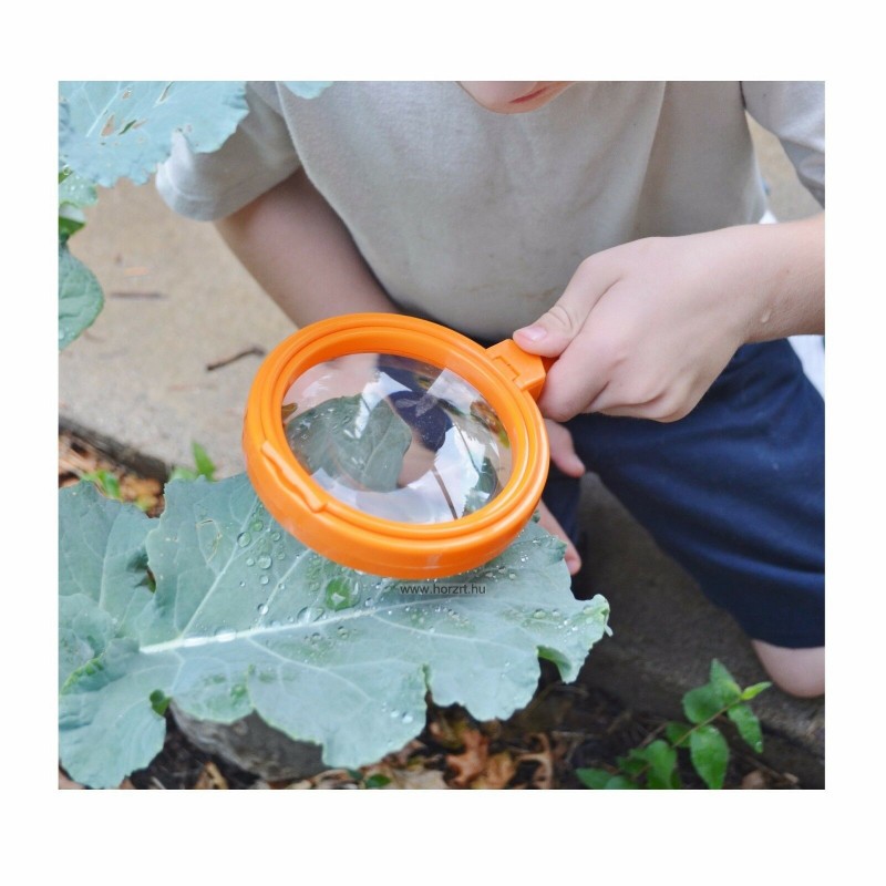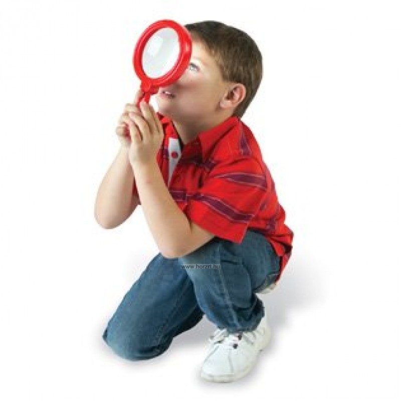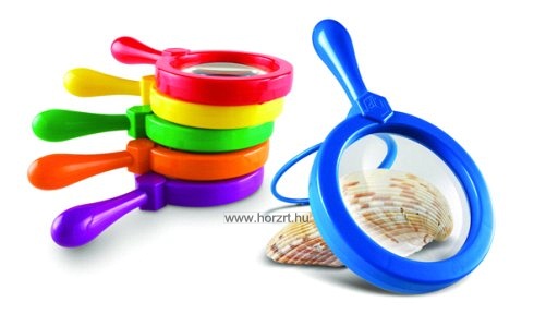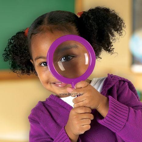 A Learning Resources óriás nagyítói különböző színekben érhetőek el, kialakításának köszönhetően ki lehet támasztani az üveg körül lévő kis kihajtható támasztóval.