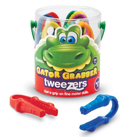 A Learning Resources finommotorikus krokodil csipeszek készletében 12 db, színes műanyag csipesz található, melyeknek mintája egy korkodik száját szimbolizálja.