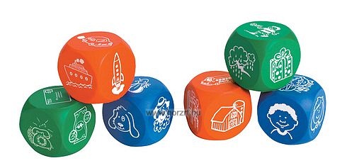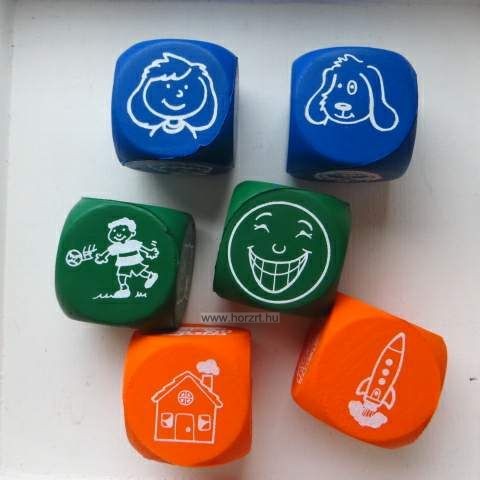 A dobókockákkal kigurított képek alapján kell összeállítani egy mesét, történetet. A gyerekek fantáziájukat, emlékeiket használva mondatokba foglalják, kibővítik a kidobott képeket, kifejezéseket.