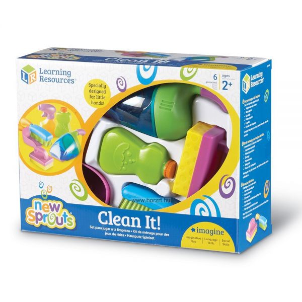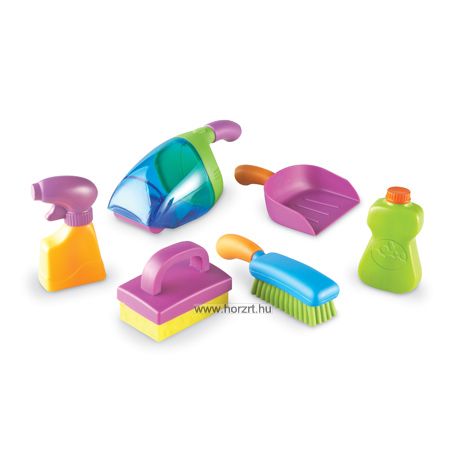 A Learning Resources takarítókészletének tartalma 1 darab kéziporszívó, 1 darab lapát, 1 darab kefe, 1 darab szivacs, 1 darab mosogatószer és 1 darab ablaktiszítóspray.