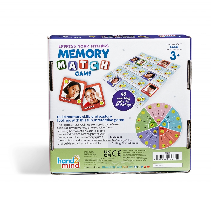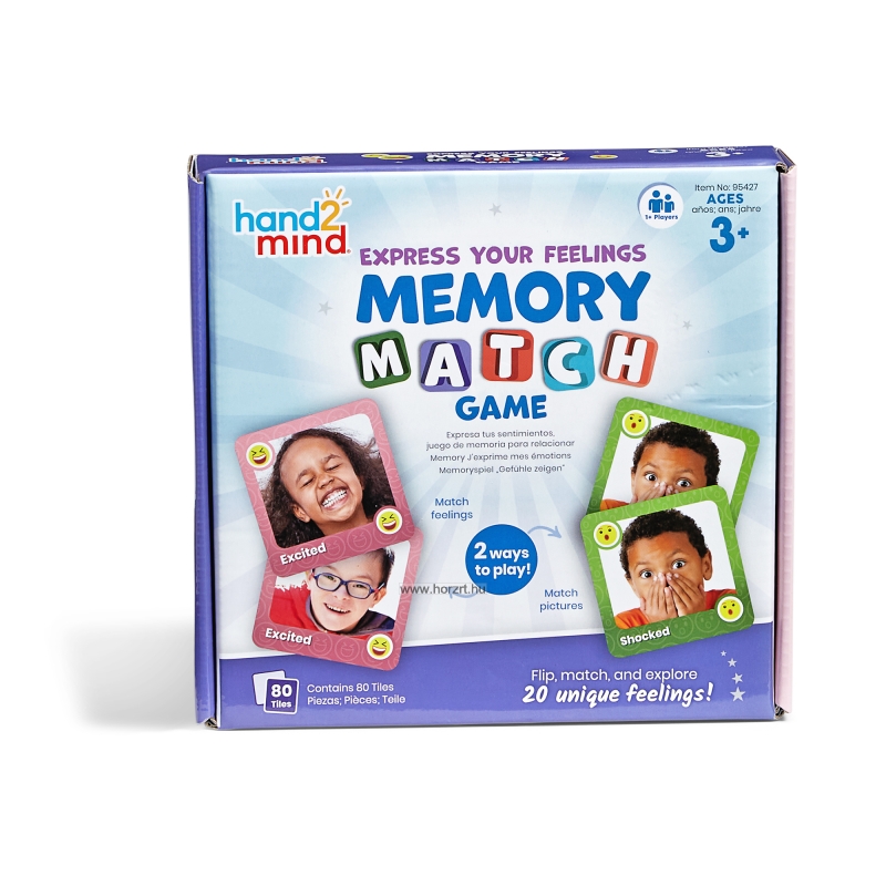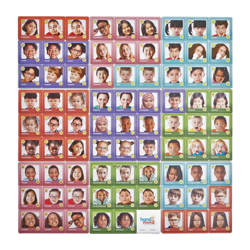 Ez az érzelemalapú memóriajáték játékosan segít a gyerekeknek felismerni és megérteni a különböző érzéseket. A klasszikus memóriajáték kétféle módon játszható: párosíthatók az azonos érzelmet kifejező arcképek, vagy ugyanaz az érzelem név és kép alapján. A sokféle kifejezés színes és életszerű fotókkal van illusztrálva, így már a 3 évesek is könnyen azonosulni tudnak velük.