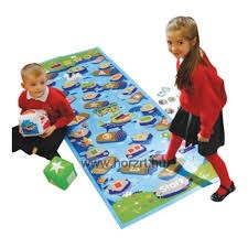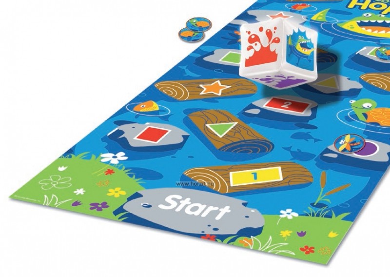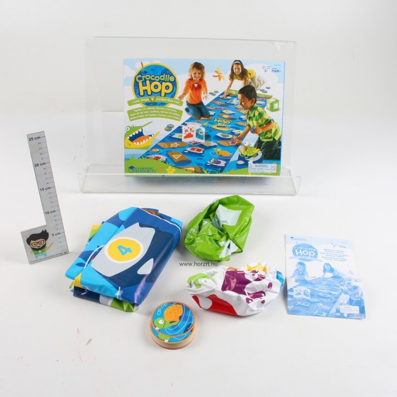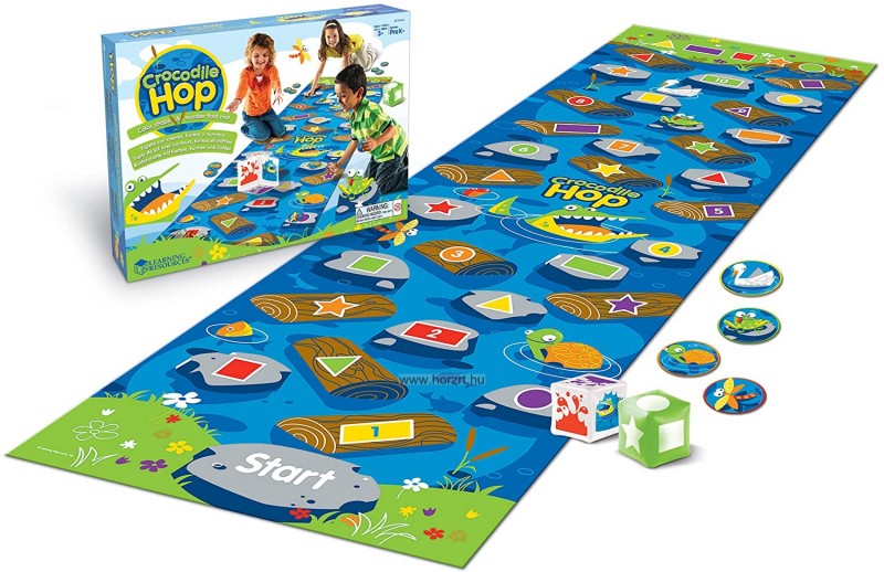 Ler 9544 Kroki hopp Ugrás a folyóba A gyerekeknek a startmezőről indulva kell eljutniuk, különböző feladatokat megoldva a célig. A folyón színről, számra ugorhatunk, a kicsik megtanulják 1-10ig a számokat és az alakzatokat is megismerik. Javítja a problémamegoldó készséget játék alkalmas egyéni, csoportos játékhoz is. Gyönyörűen illusztrált pálya tele kövekkel akadályokkal úszó fadarabokkal állatokkal és egy aranyos kis krokodillal aki visszaküld a start mezőre. Tartalmaz: Játékszőnyeg 40 jelölő (4 állat 10mindegyikből) 2 felfújható dobókocka Játékleírás Játékleírás Nevezd meg a színt vagy a formát Terítsük ki a szőnyeget a padlón. A tanulók álljanak a start-hoz majd nevezzenek meg minden színt és formát úgy, hogy ráállnak egy kőre vagy fadarabra. Ha sikerül megnevezni tovább léphetnek. Folytassuk amíg át nem ér mindenki a folyón Jelölő Terítsük ki a szőnyeget. A tanár dob a szín kockával és a tanulók megkeresik az összes követ és fát a megfelelő színnel majd egy jelölőt helyeznek rá. Folytassuk új dobással és új jelölésekkel. Ha krokodilt dobunk minden jelölőt szedjünk le. Ismételjük meg a játékot a forma kockával. Formafelfedező Terítsük ki a szőnyeget. Dobjunk mindkét kockával és nevezzük meg a kombinációt (pl Sárga kör) Ha a gyerekek meglátták a megfelelő kombinációt kézfeltartással jelzik. A tanár kihív egy jelentkezőt és a jelre állítja. Ismételjük amíg mindenki helyet talált. Ha krokodilt dobunk bármilyen kombinációt mondhatunk Átkelünk a folyón Terítsük ki a szőnyeget. A tanulók próbáljanak úgy végig sétálni rajta, hogy csak a számozott kövekre és fákra lépnek. Ahogy halad mondja hangosan a számokat, amiken áthalad. Remek módszer a számok felismerésére. Visszafele számolni is gyakorolhatunk ezesetben a tanulók a 10es mezőről kezdenek. játékok átkelünk a folyón színekkel (2-4 játékos vagy csapat) Hozzávalók Játékszőnyeg szín kocka állatos jelölő minden játékosnak/csapatnak Helyezzük a szőnyeget a padlóra, hogy mindenki lássa. Minden játékos/csapat választ egy jelölőt és a start mezőre helyezi. Az első játékos dob a szín kockával majd a jelölőt a legközelebbi azonos színű kőre vagy fára helyezi. A játékosok folytassák amíg valaki a végére nem ér a folyónak. Aki krokodilt dob egy körből kimarad. Aki számozott mezőre érkezik újra dobhat, ha felismeri a számot! átkelünk a folyón formákkal (2-4 játékos vagy csapat) Hozzávalók Játékszőnyeg forma kocka állatos jelölő minden játékosnak/csapatnak A játék megegyezik a fenti leírással kivéve, hogy ezúttal a forma kockával dobunk és a formákra lépünk Vad krokodil (2-4 játékos) Hozzávalók Játékszőnyeg Forma kocka Szín kocka 3 jelölő minden csapatnak Terítsük le a szőnyeget. A játékosok dobnak mindkét kockával majd a megfelelő helyre helyezi az egyik jelölőt. A következő játékos is így tesz. A játékosok dönthetnek, hogy egy új jelölőt vagy egy már használtat hoznak játékba. Az a játékos nyer, akinek mind a három jelölője elsőnek ér célba. • Ha valaki a szín kockával krokodilt dob, bármilyen kidobott színű, de a forma kockának megfelelő mezőre léphet • Ha valaki a forma kockával krokodilt dob, bármilyen kidobott formájú, de a szín kockának megfelelő mezőre léphet • Ha valaki mindkét kockával krokodilt dob, az bárhova léphet!