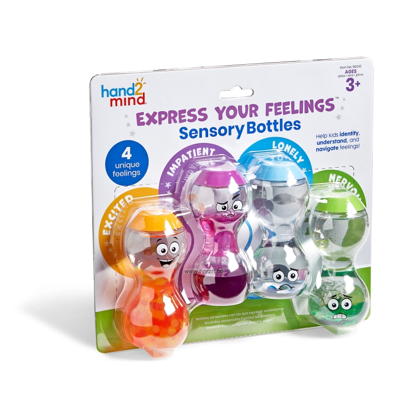 A csomag négy különböző érzelmet kiábrázoló szenzoros palackot tartalmaz, mindegyik más-más színnel, tartalommal és arckifejezéssel illusztrálja az adott érzést: