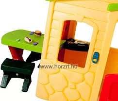 Kerti játszóház piknikasztallal a következő elemekkel felszerelt: konyha tűzhellyel és sütővel, mosogató, kandalló, piknikasztal székekkel, működő bejárati ajtóval, postaládával és ablakokkal. Tartalmaz 19 különböző kiegészítőt - élelmiszerek főzéshez, edények, telefon és elektromos kapucsengő, mely 6 különböző hangot bocsát ki. Az ajtócsengő működéséhez 3db elem szükséges.
