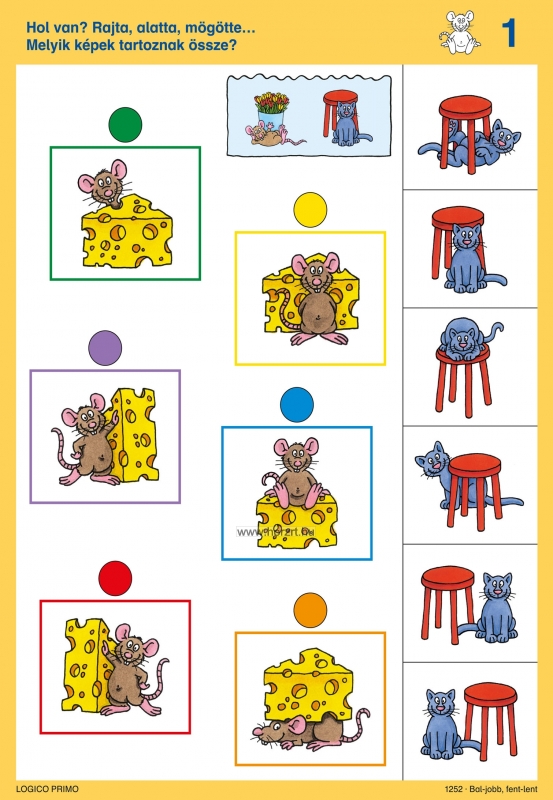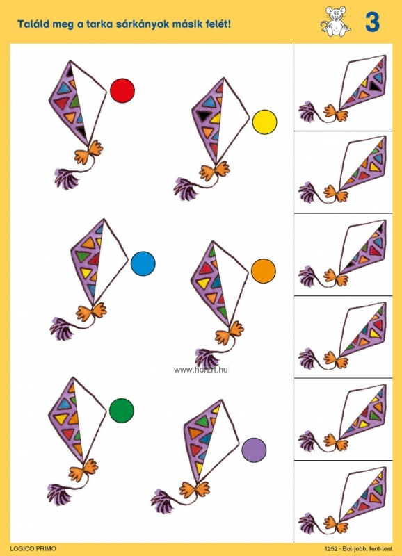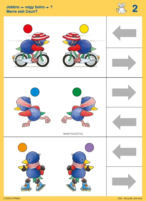 3 éves kortól Tartalma: 16 db feladatkártya, a hátoldán a megoldásokkal A Bal-jobb, fent-lent az alábbi témákat dolgozza fel: Térbeli irányok, a képeken látható tárgyak és kedves állatfigura szereplők egymáshoz való pozíciójának felismerése. Térbeli tájékozódás Logikai kapcsolatok Párosító feladatok Tükörkép A Logico Primo feladatkártyák csak a Logico Primo kerettel együtt használhatóak!