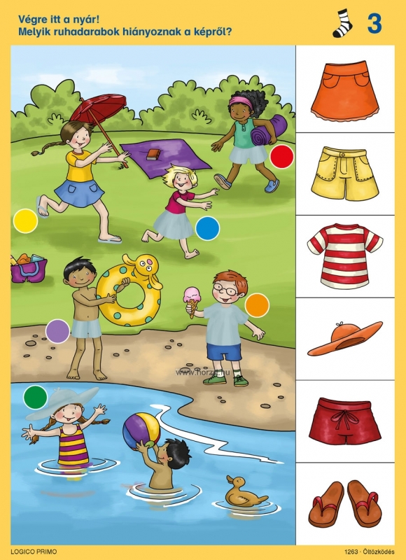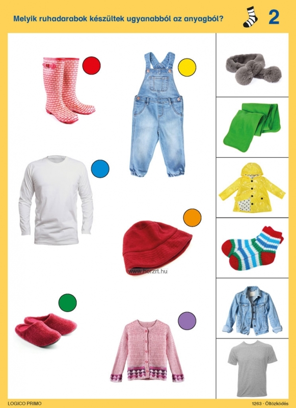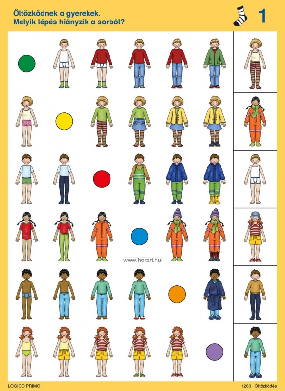 3 éves kortól Tartalma: 16 db feladatkártya, a hátoldán a megoldásokkal Az Öltözködés az alábbi témákat dolgozza fel: A ruhadarabok felvételének sorrendje Képrészletek felismerése Melyiket kell előbb felvenni? Milyen az anyaga? Milyen a mintája? Ebben a feladatfüzetben már nem csak rajzok, hanem fotók is szerepelnek. A Logico Primo feladatkártyák csak a Logico Primo kerettel együtt használhatóak!